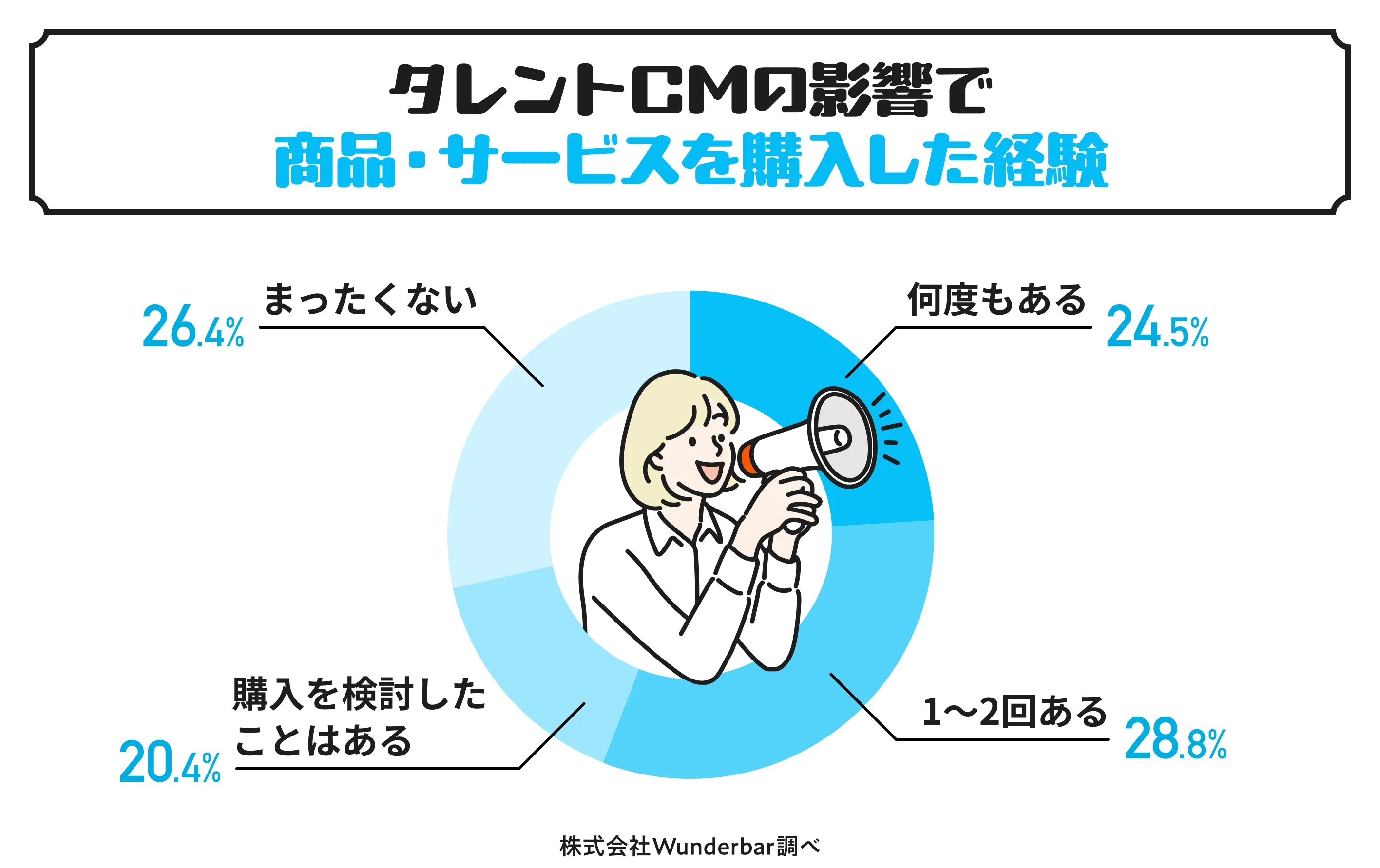 さらに、購買行動に焦点を当てると、約4人に1人がタレントCMをきっかけに商品を購入したり、購入を検討したりした経験があることがわかりました。