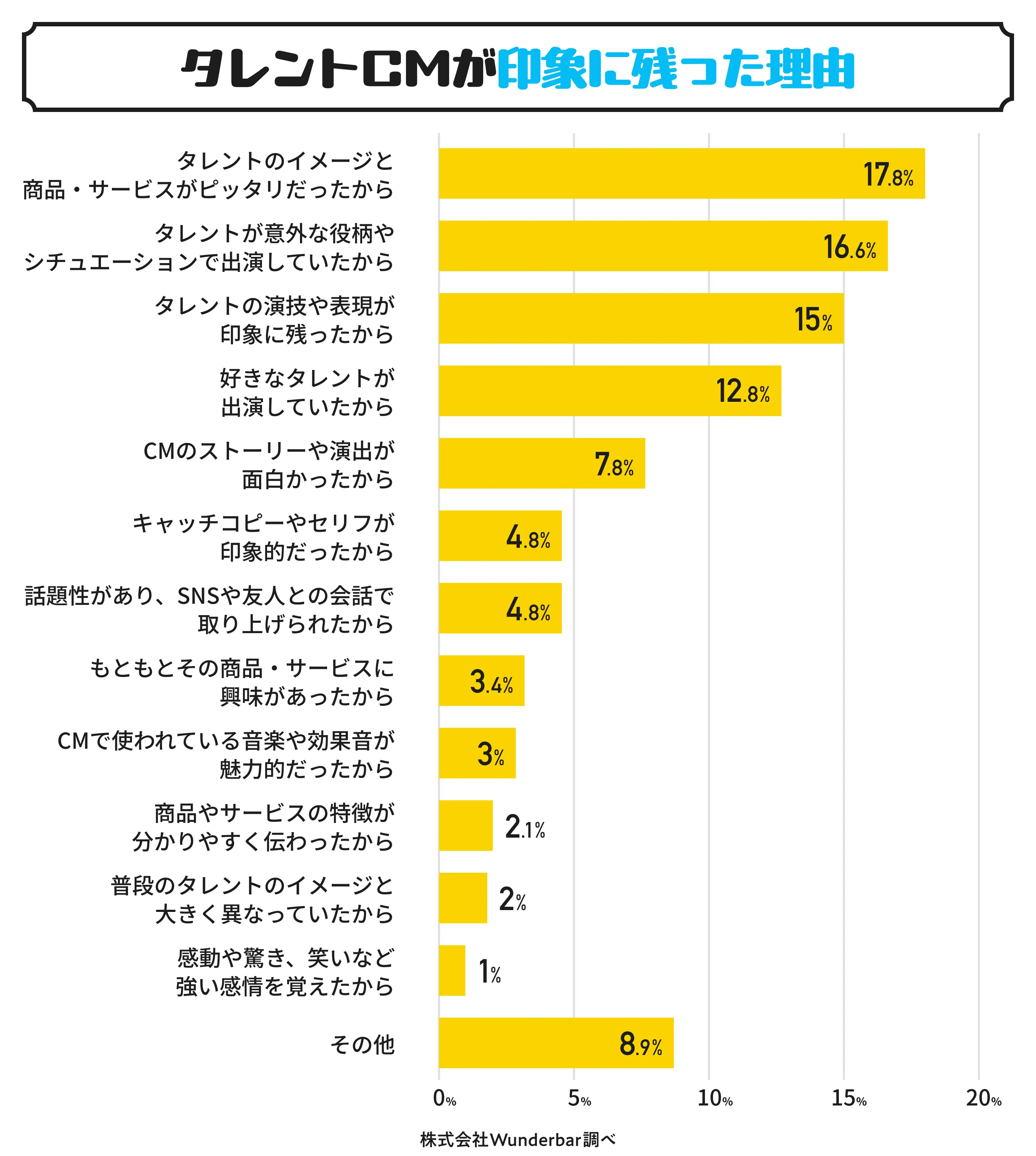 ほかにも、「タレントが意外な役柄やシチュエーションで出演していたから(16.6%)」「タレントの演技や表現が印象に残ったから(15%)」「好きなタレントが出演していたから(12.8%)」といった理由が票を集めました。