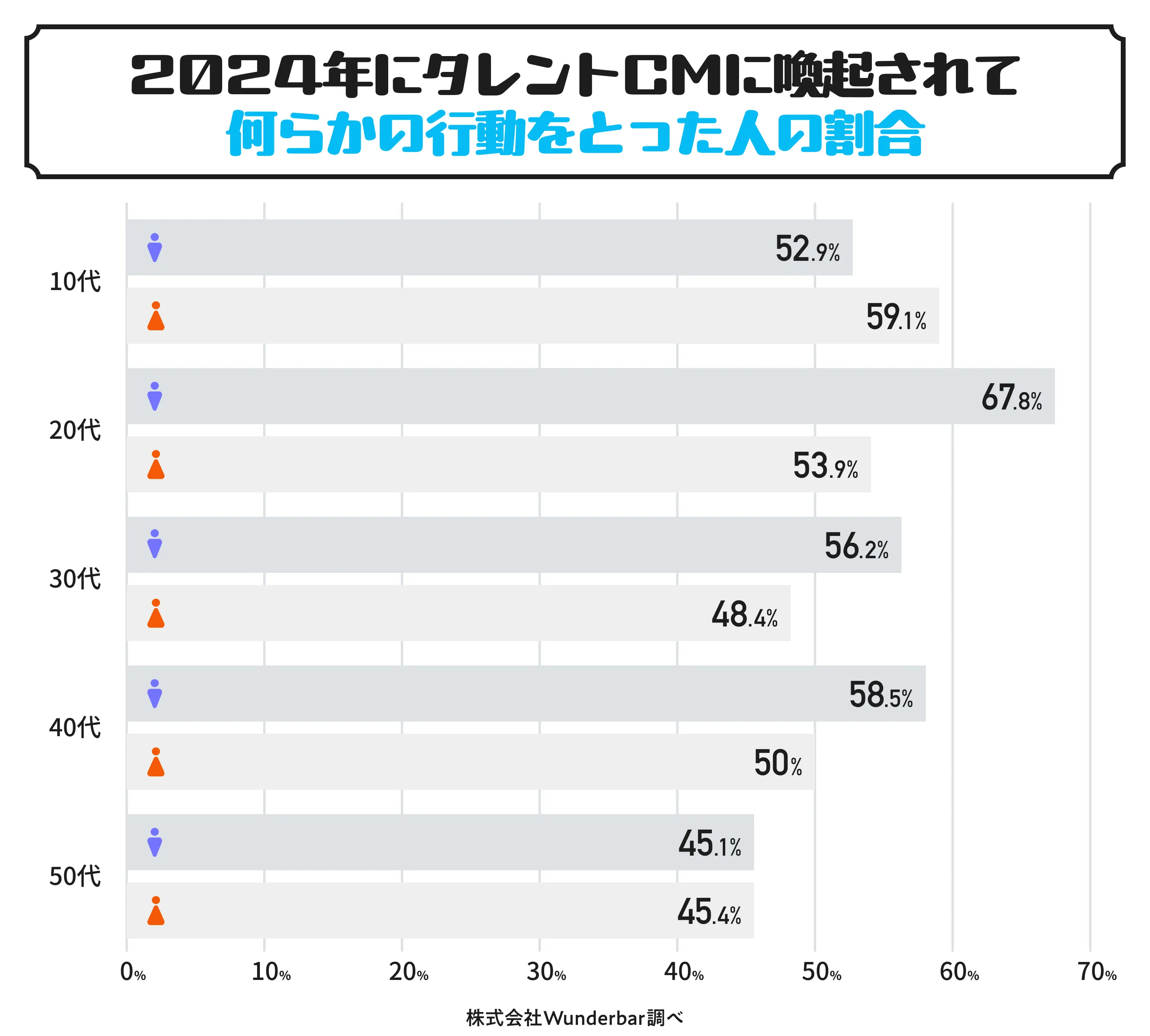今年、タレントCMに喚起されて何らかの行動を起こしたことがある人の割合は、全体で過半数に達しています。