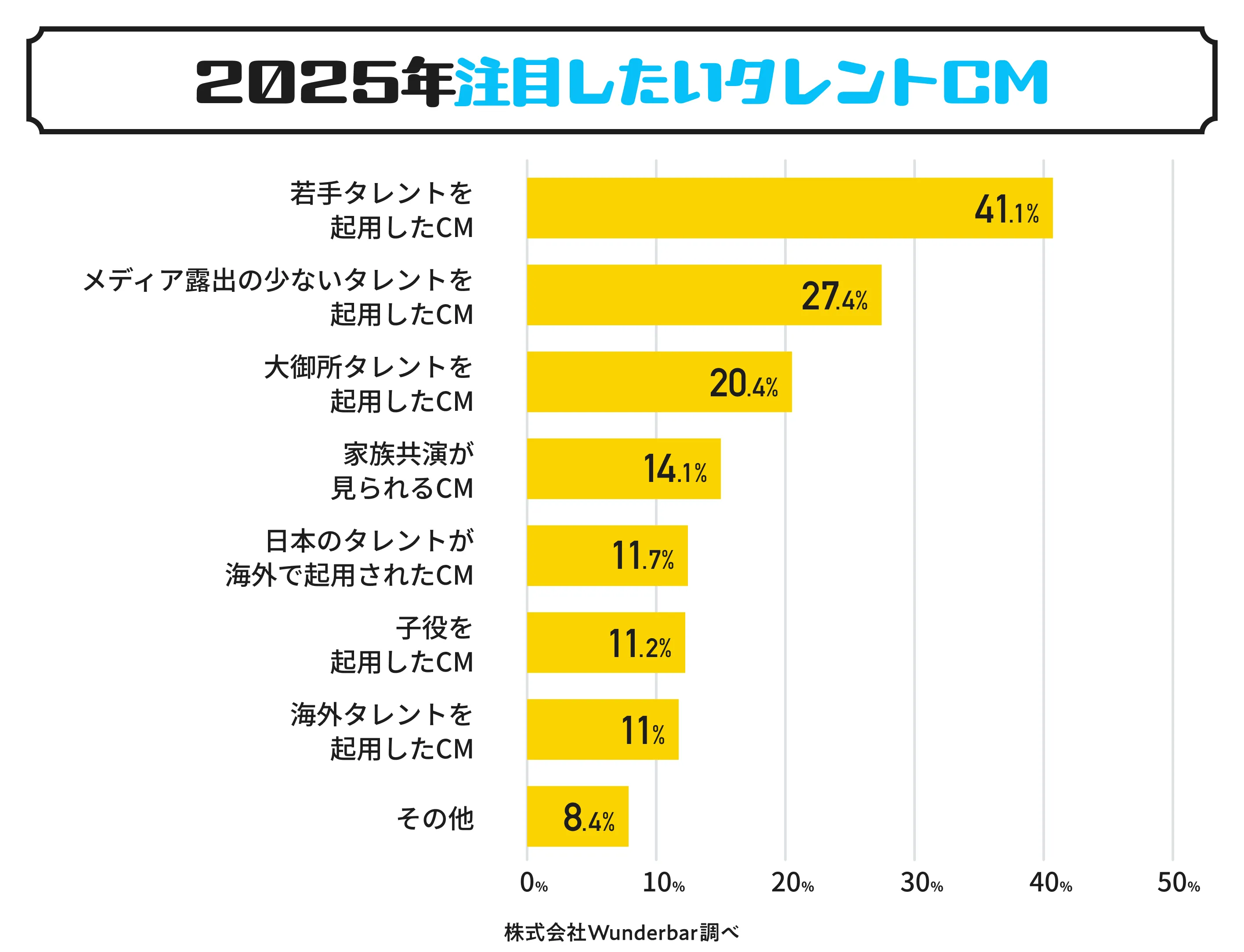 2025年に注目したいタレントCMの特徴として票を集めたのは、「若手タレントを起用したCM(41.1%)」や「メディア露出の少ないタレントを起用(27.4%)」でした。
