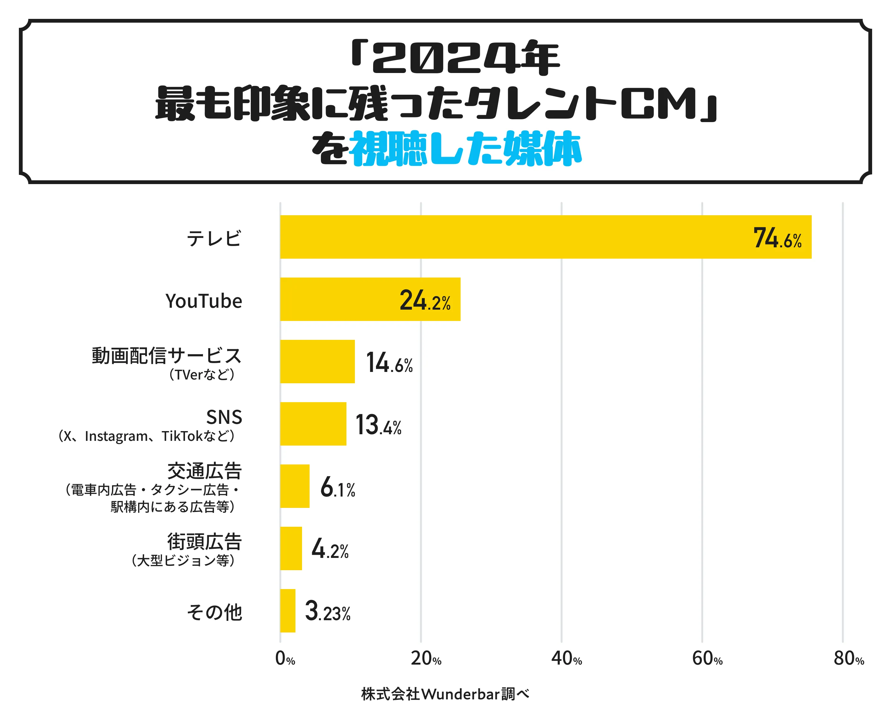 2024年最も印象に残ったタレントCMを視聴した媒体としては、テレビが74.58%とダントツ。