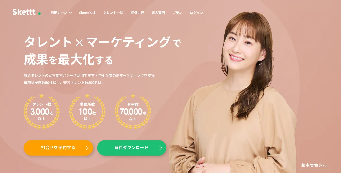 100社以上の事務所と提携している、IPマーケティングサービス「Skettt(スケット)」を活用すれば、3000名を超えるタレントの中から、自社とマッチしたタレントをキャスティングすることができます。