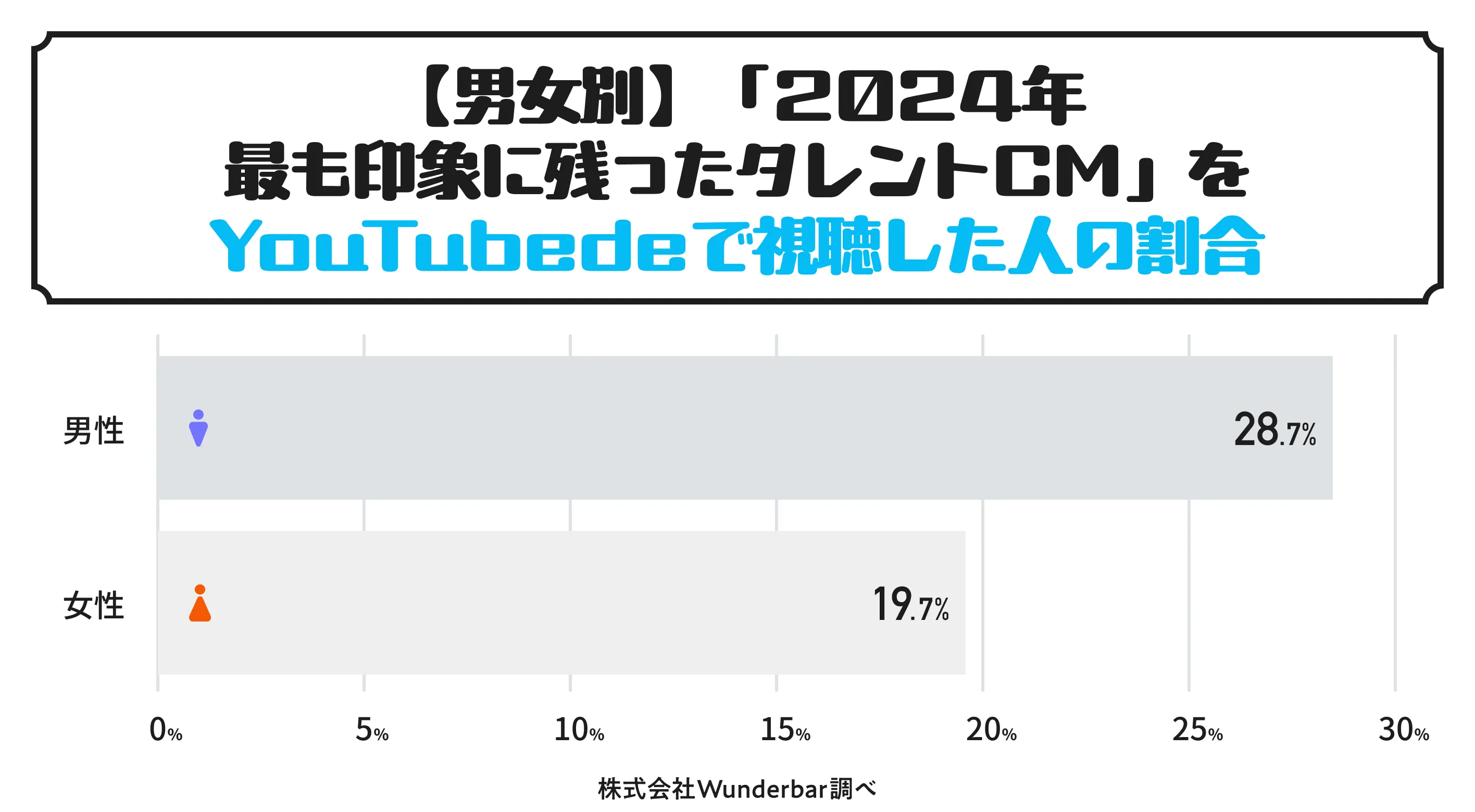 また、そのCMをYouTubeで視聴したと答えた人の割合について男女別で比較すると、男性は28.7%と女性より9%も高い結果となりました。