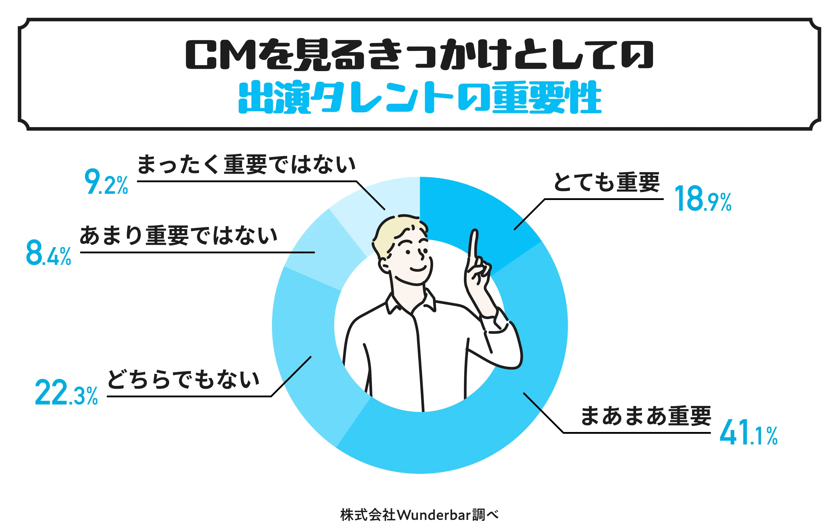 「CMを見るきっかけとして出演しているタレントがとても重要である」、あるいは、「まあまあ重要である」と回答した人の割合は、全体の60%にのぼります。