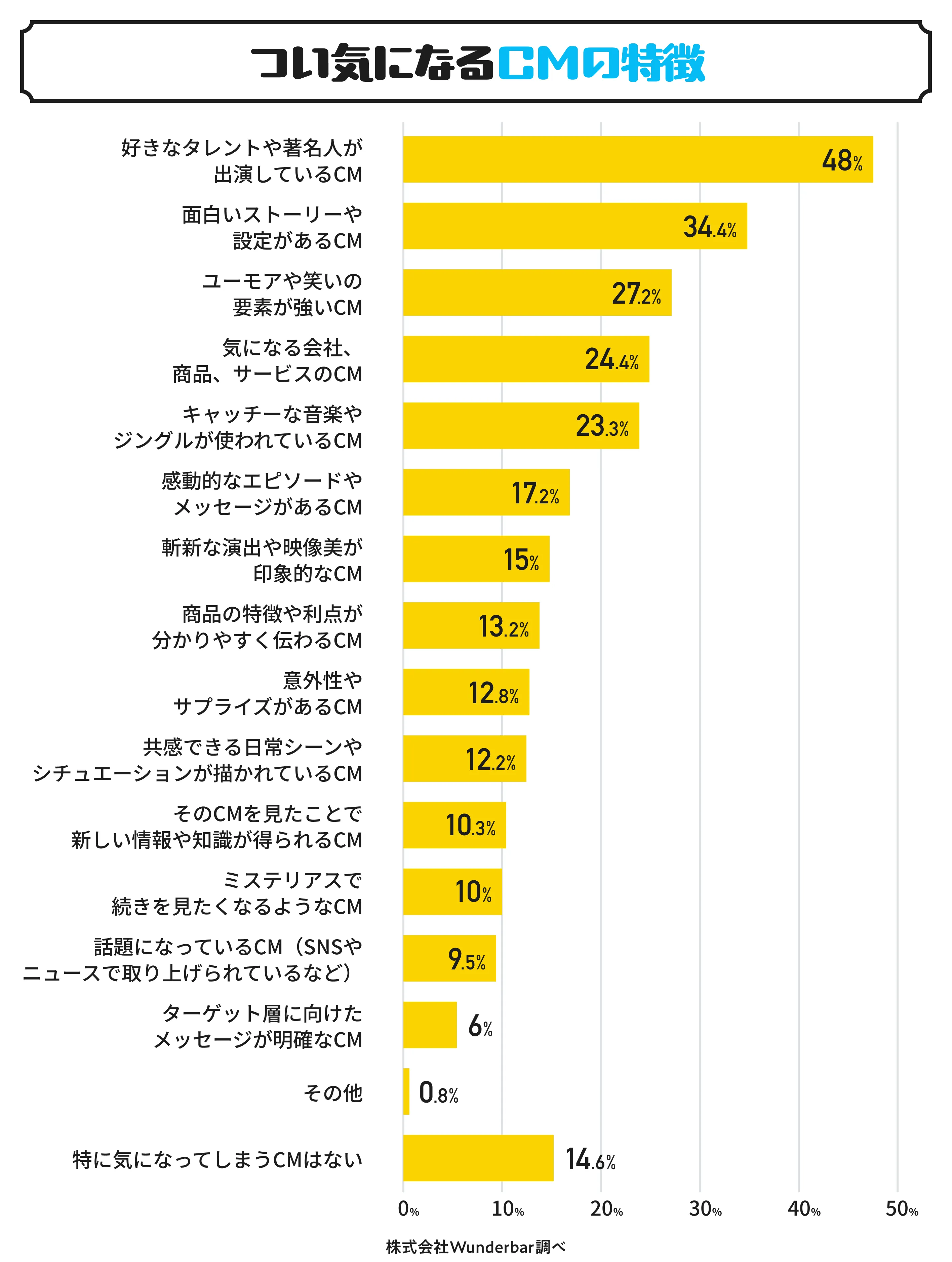 また、タレントの出演の有無にかかわらず、「面白いストーリーや設定があるCM(34.4%)」「ユーモアや笑いの要素が強いCM(27.2%)」「気になる会社・商品・サービスのCM(24.4%)」「キャッチーな音楽やジングルが使われているCM(23.3%)」は、約3〜4人に1人がつい気になることが判明しました。
