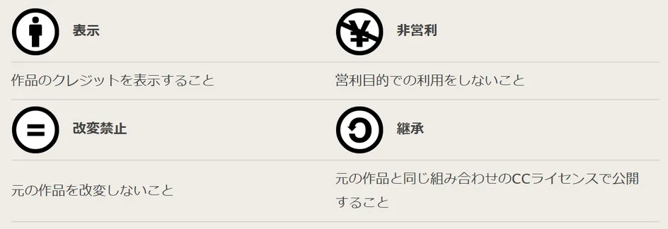 クリエイティブ・コモンズ・ライセンスの条件の組み合わせの種類は、以下の6つです。