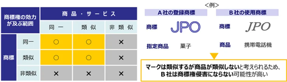とくに注意すべきは、完全に同一でなくても、商標やサービス、使用範囲が「類似する」と判断される場合も権利侵害となりえることです。一方で、商標が同一だったとしても使用範囲がまったく異なる場合は権利侵害にならない可能性が高いといえます。