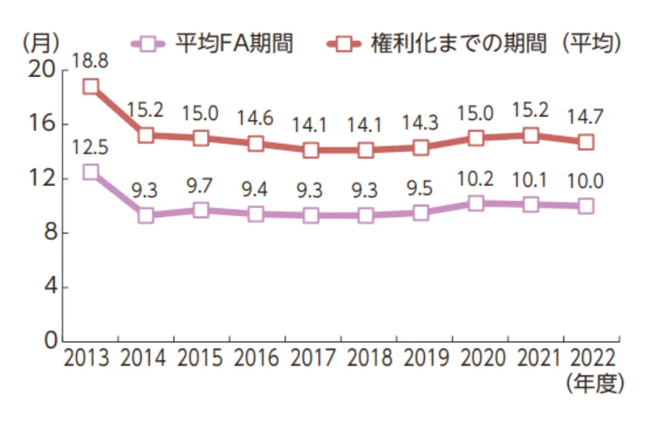 特許庁によると、2022年度の「権利化までの期間」(標準審査期間)は14.7か月、「一次審査通知までの期間」は、10か月です。
