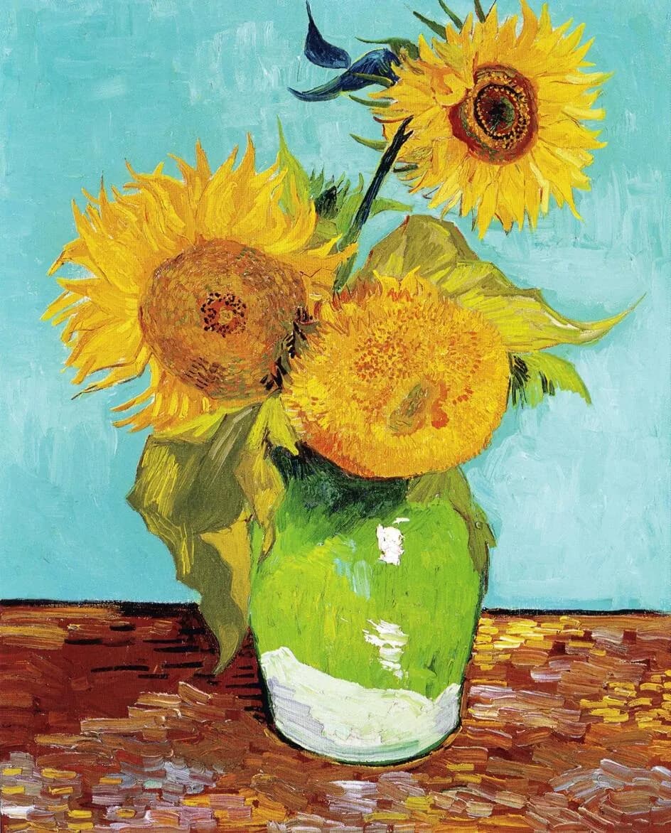 しおれたものから満開のものまで、さまざまな段階のひまわりが描かれています。生前売れることはありませんでしたが、ゴッホの死後オークションにて高値で取引されるようになりました。