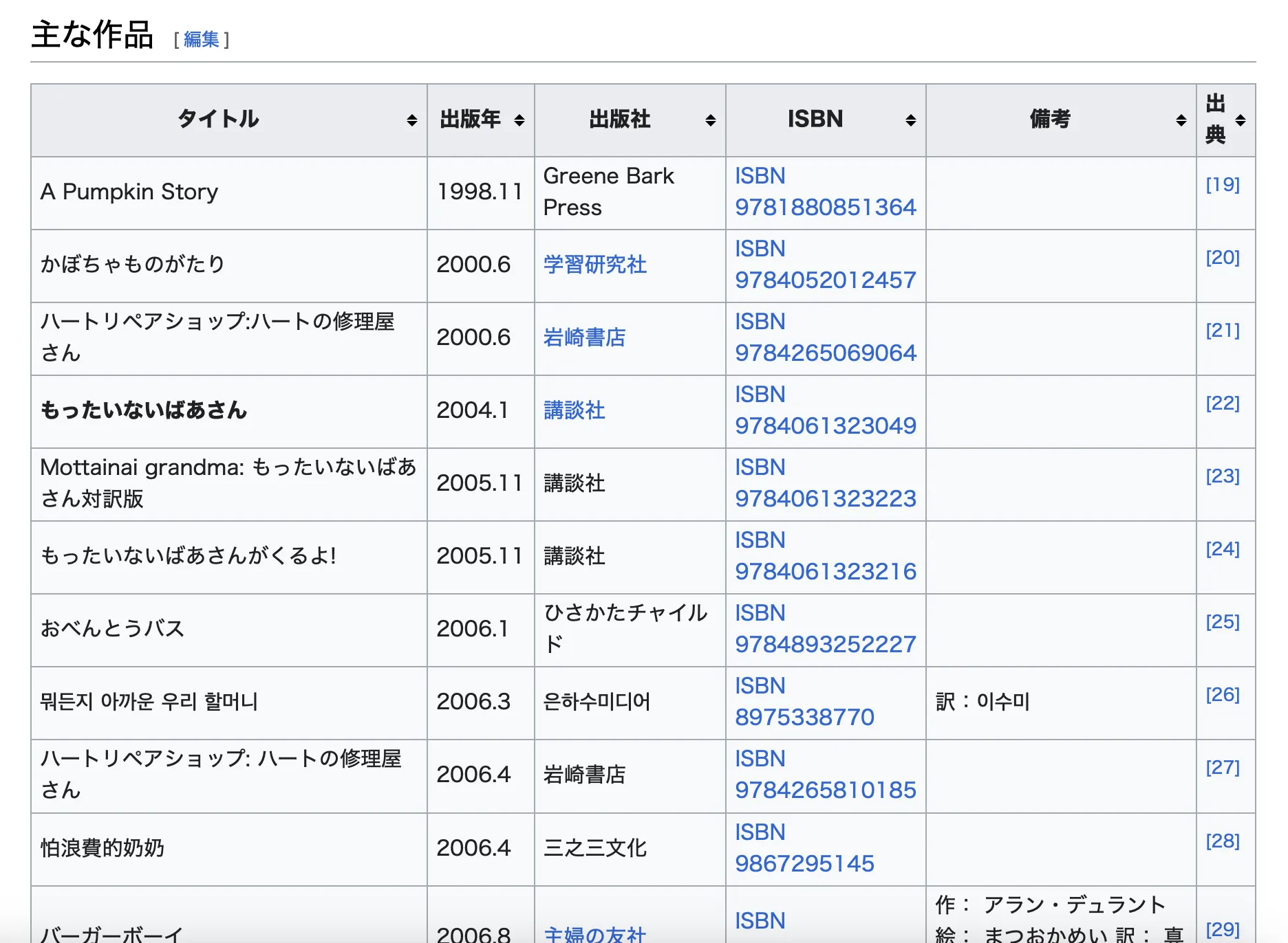真珠まりこさんの作品を、絵と文両方手がけたものはもちろん、翻訳されたものや絵のみをご担当されたもの、すべて表にして掲載。タイトルや出版年、出版社、ISBN、備考の有無、出典番号、それぞれ昇順、降順に入れ替えて閲覧することができます。