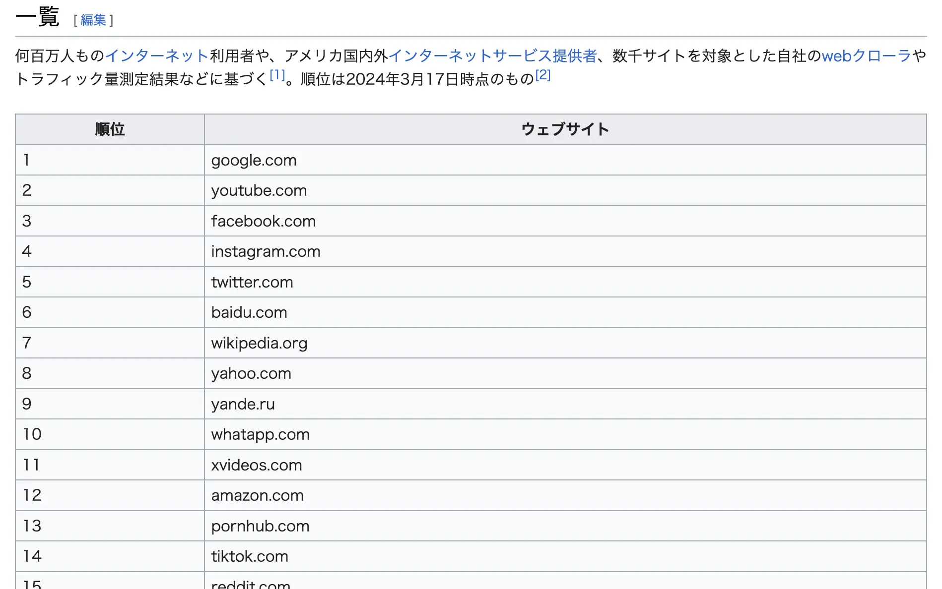 webサイトやアプリの分析をするSimilarWebによる情報を掲載した、Wikipedia上の「人気のウェブサイト一覧」を開くと、Google、YouTube、Facebook、Instagram、X(旧Twitter)、Baiduに続いて7番目にアクセスが多いことがわかります(2024年5月30日時点)。