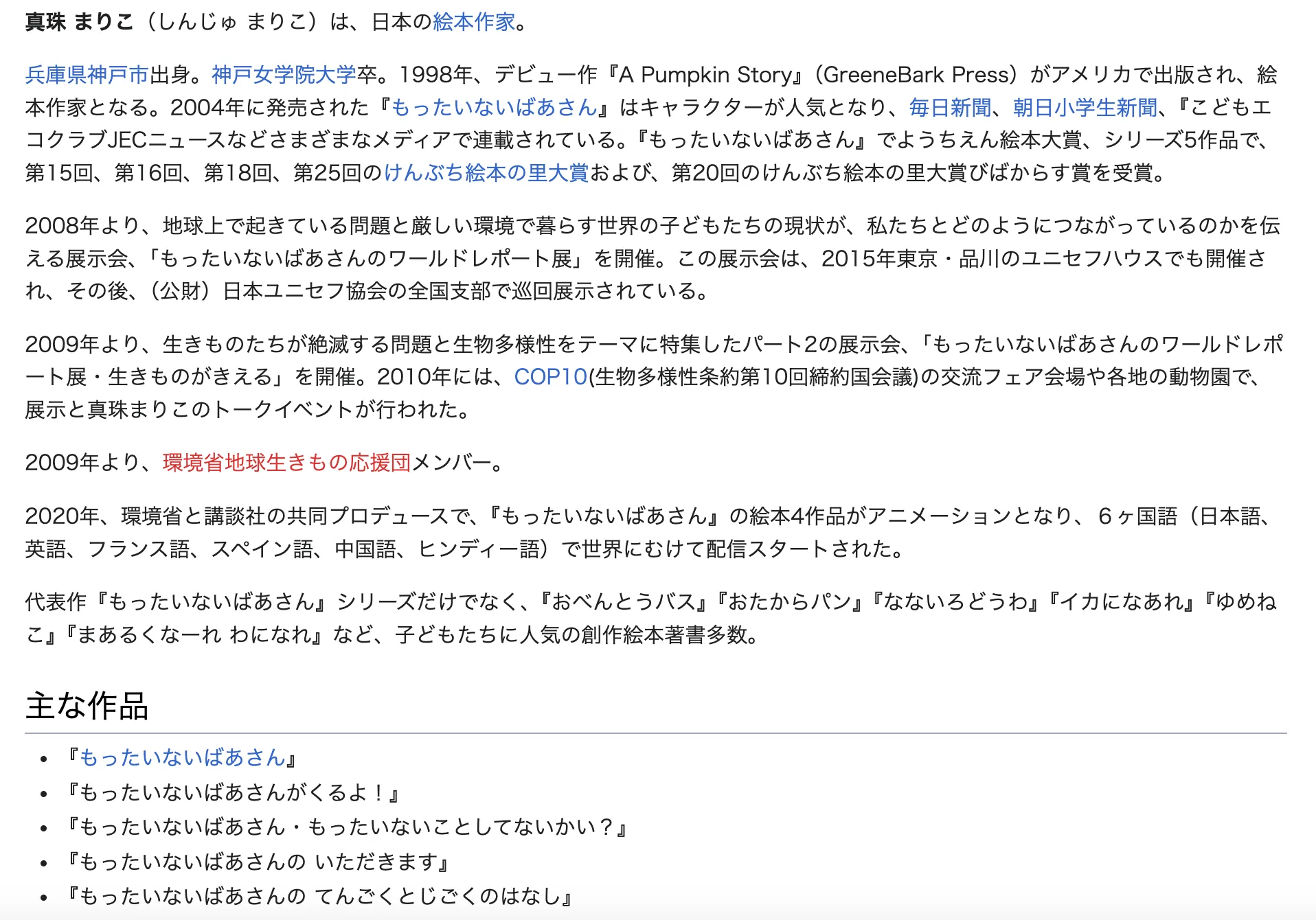 この記事を執筆している2024年5月末時点では、Googleで「真珠まりこ」と検索すると3番目にWikipediaが表示されます。ということは、彼女について知りたいと思った方がWikipediaに流入する可能性はおおいにあると考えられるということ。