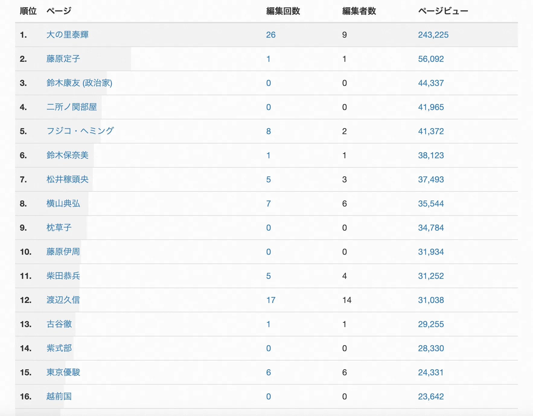 この日の1位は、新小結の大の里泰輝さん。大相撲夏場所千秋楽にて初の幕内優勝を果たしたことで、検索した方が増えたのではないかと推測できます。そのPV数は、2位の5.6万PVの「藤原定子」に圧倒的な差をつけ、24.3万PV。