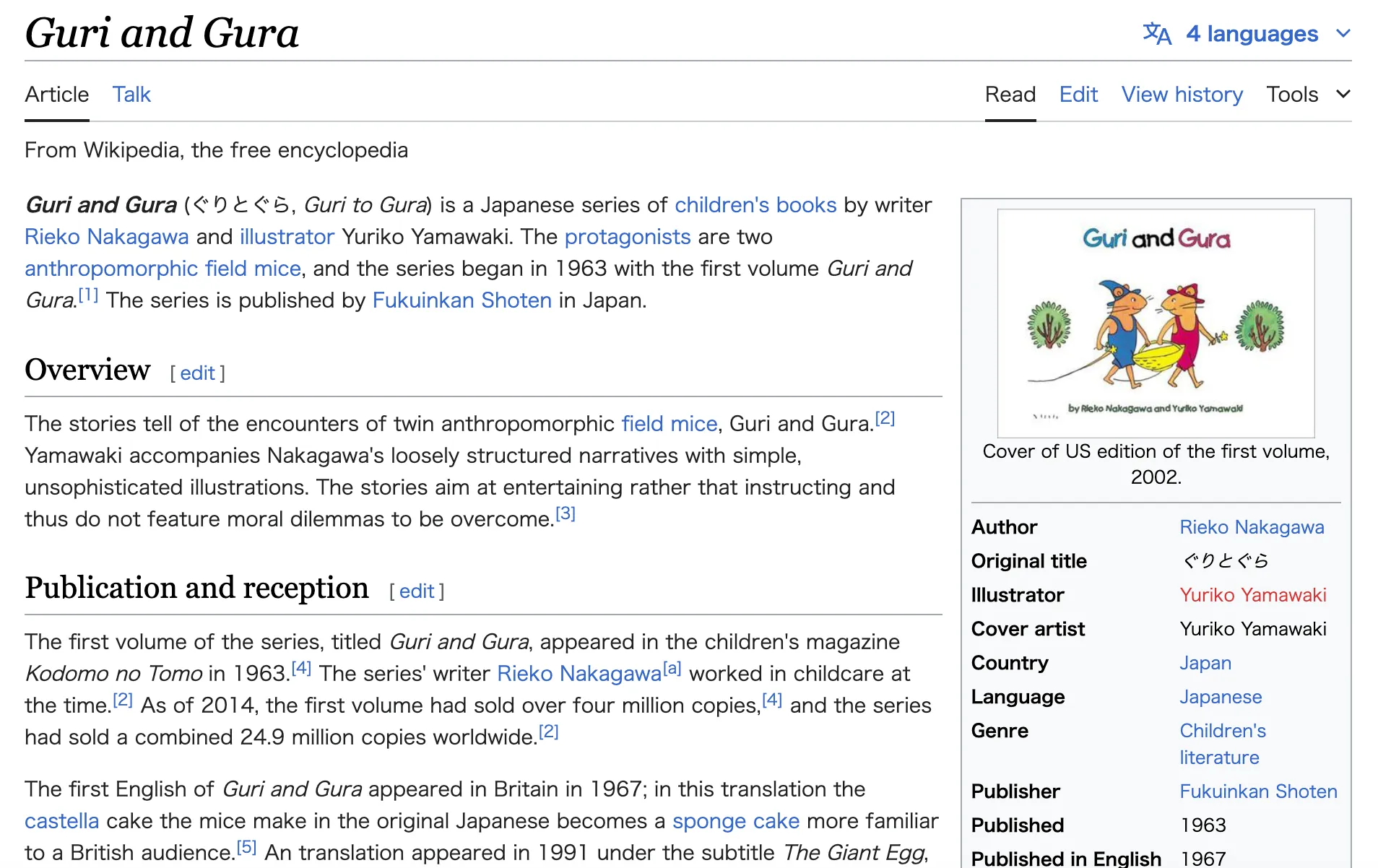 知らない人にとっては表紙イメージが表示されていたほうが伝わりやすいと思いますが、たとえば『ぐりとぐら』シリーズ(1967年〜、福音館書店)の英語版には画像が掲載されているのに対して、日本語版には掲載されていません。