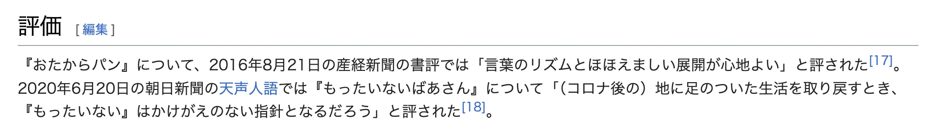 客観的な視点をもたせるために、だれがどういった場所で真珠まりこさん、あるいは彼女の作品を評価しているかという情報を追記。