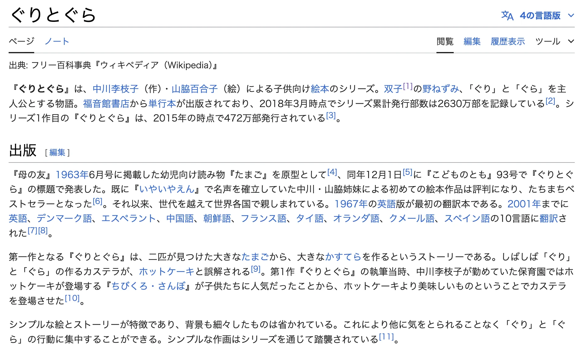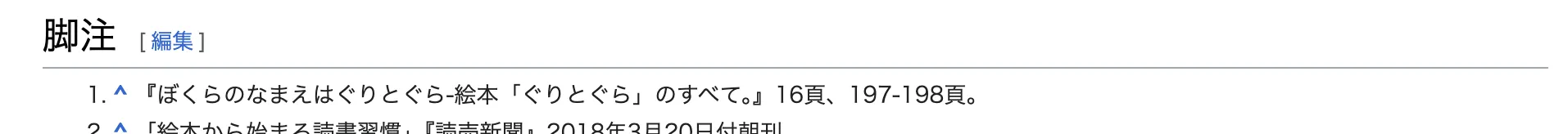 さらにこの日本語版のページを見ていくと、たとえば2文目の「双子の野ねずみ」という「双子」の部分に「1」というリンクが貼られているのがわかります。クリックすると、『ぼくらのなまえはぐりとぐら-絵本「ぐりとぐら」のすべて。』という書籍の16ページと197-198ページに記述があるということが確認できます。