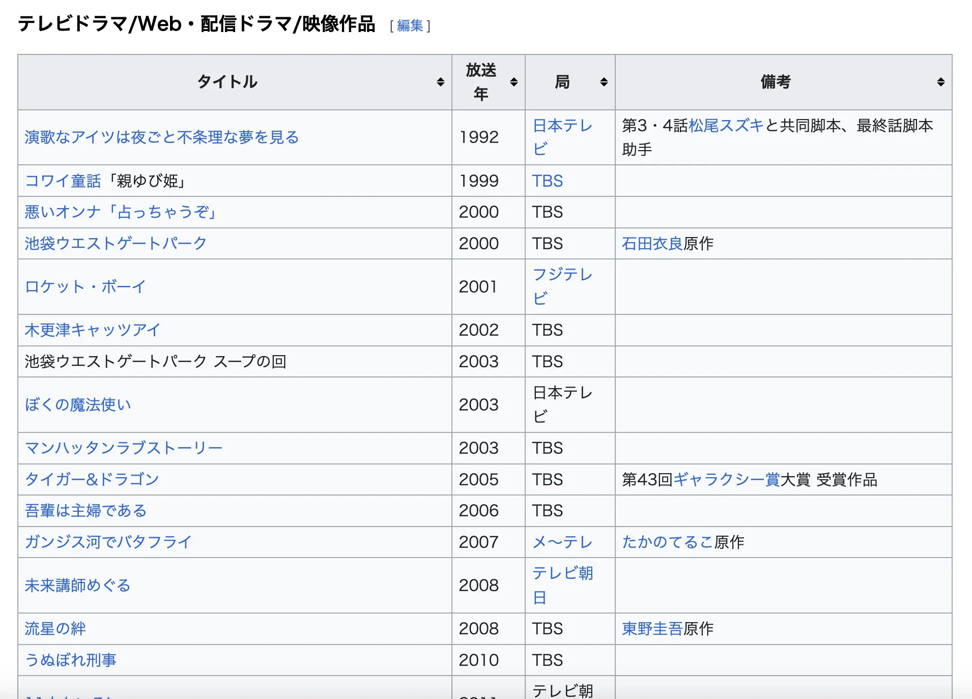 テレビ局別にソートできるようになったことで、どの局で脚本を手がけることが多いのか、といったことはもちろん、たとえば日本テレビは2016年に『ゆとりですがなにか』が放送されるまで13年空いていたことがわかるなど、宮藤さんご本人がお仕事を受ける際に参考にするとおっしゃっていた情報を一元化して確認することができるようになりました。