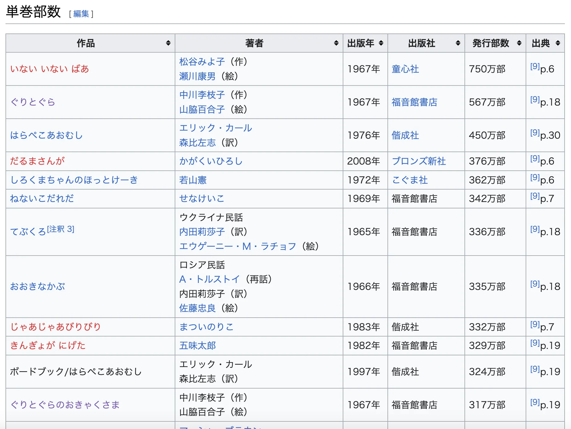 Wikipedia内の「ミリオンセラーの絵本一覧」を開くと、日本での発行部数が100万部を突破した絵本を表で見ることができます。
