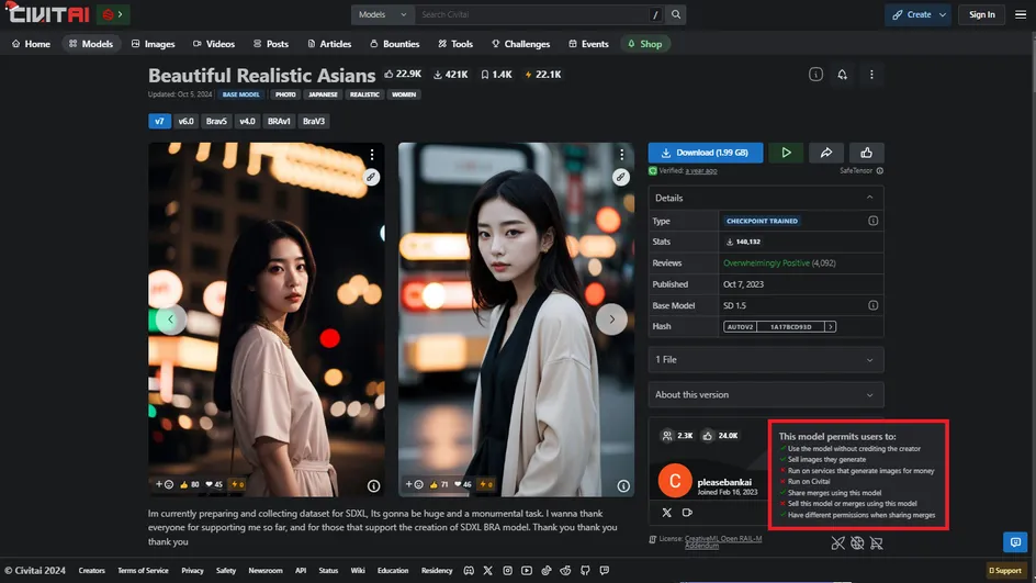 画像生成AIプラットフォームである「Civitai」は、各モデルのページでライセンスの細かな内容が確認できます。