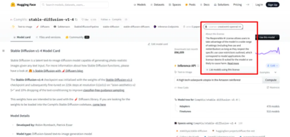 Civitaiと同じく、画像生成AIの実行環境である「Hugging Face」も、モデルのページからライセンスの概要を確認可能です。
