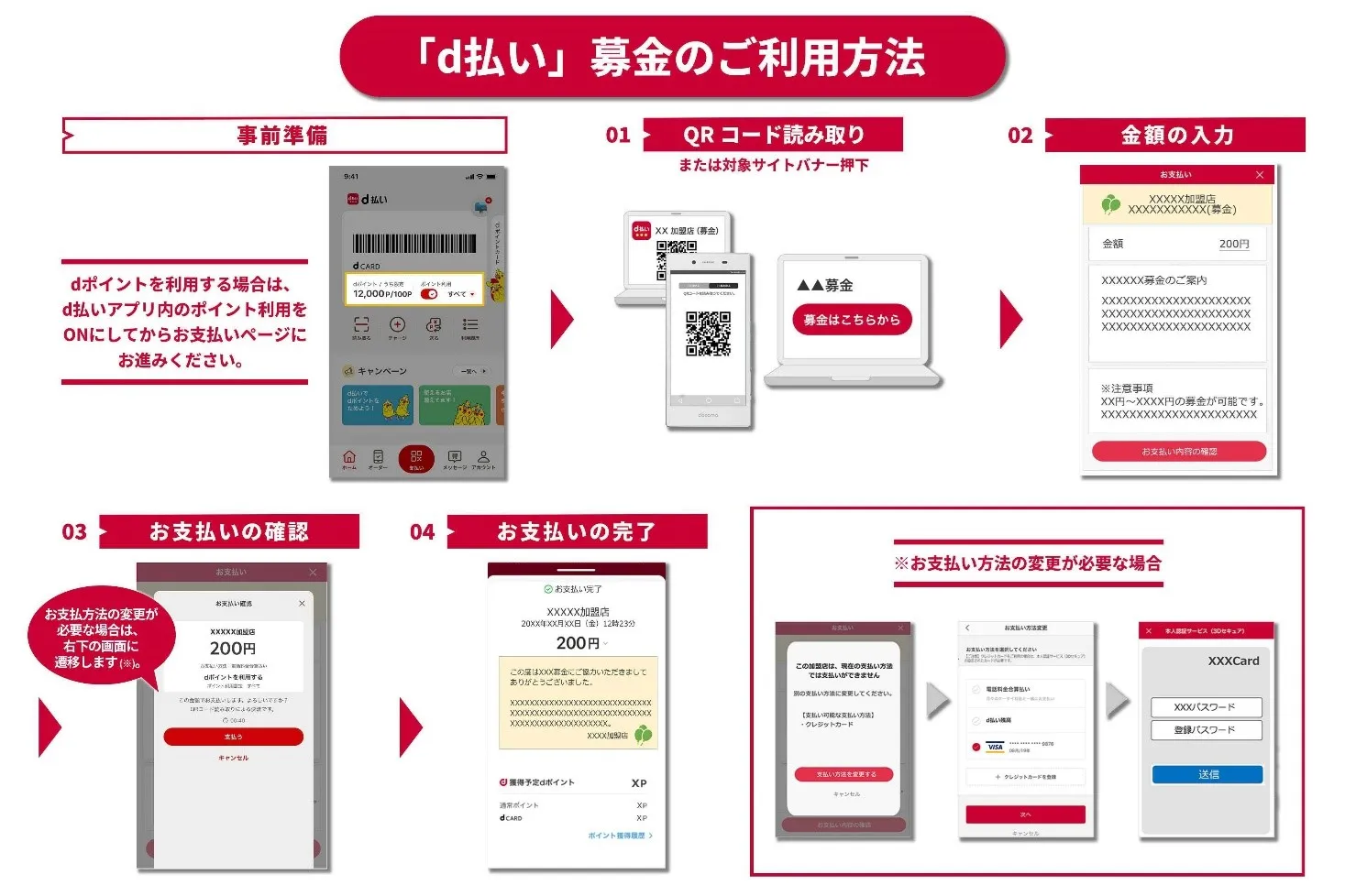 「d払い」アプリより、対象QRコードの読み取るか、公式サイトからアクセスすることで、手軽に募金に参加することができます。