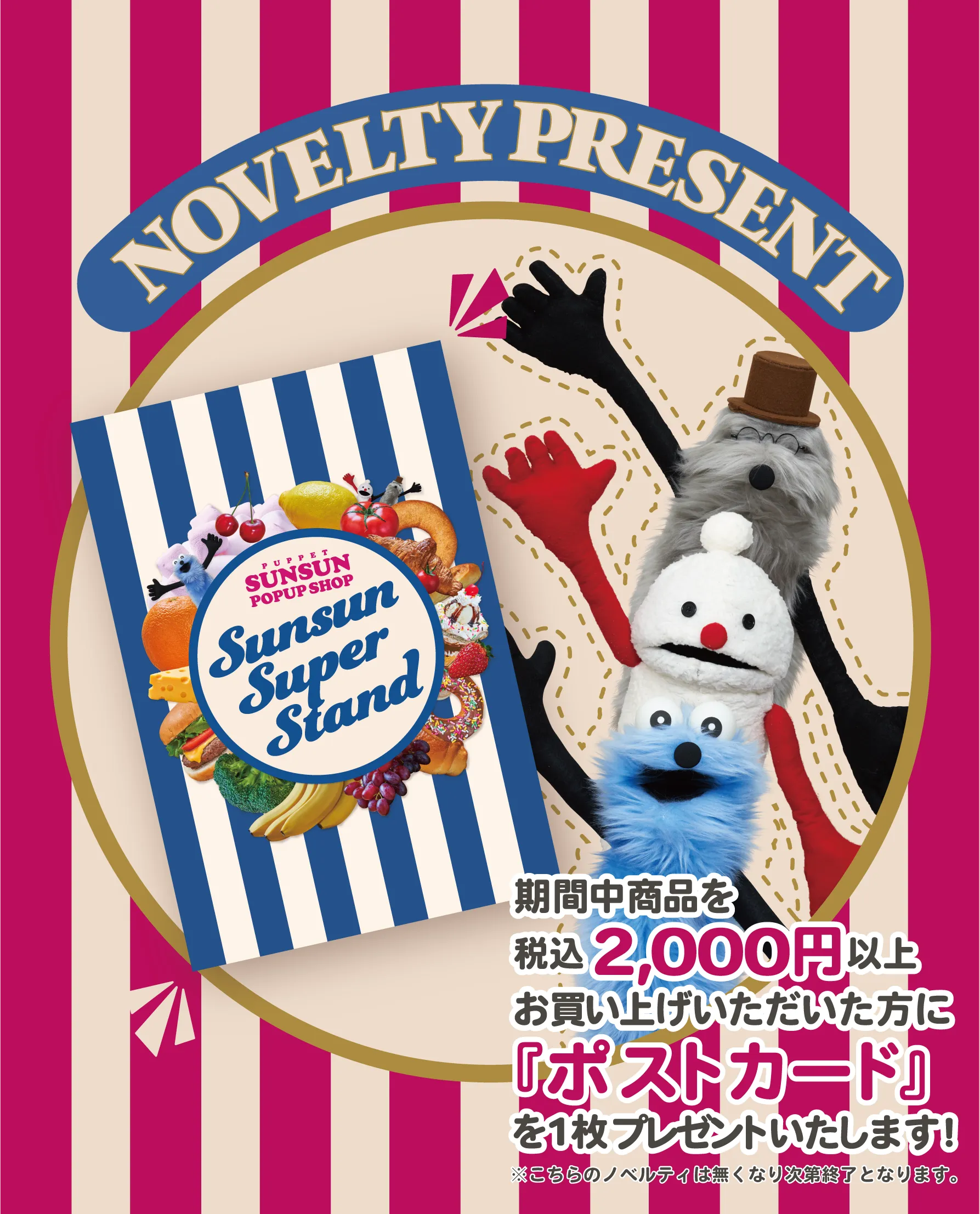 開催期間中、パペットスンスン関連商品を合計2,000円(税込)以上ご購入された方限定で、当店のポストカードをゲットすることができます。数量限定で、なくなり次第終了となりますので、ご注意ください。