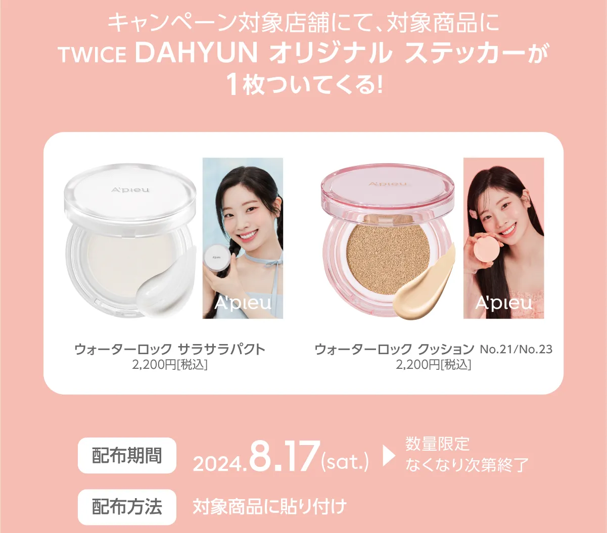 2024年8月17日(土)より、わがままを叶える韓国コスメブランド「A’pieu (アピュー)」のミューズを務めるTWICEのDAHYUN(ダヒョン)のステッカーが当たるキャンペーンが実施されます。
