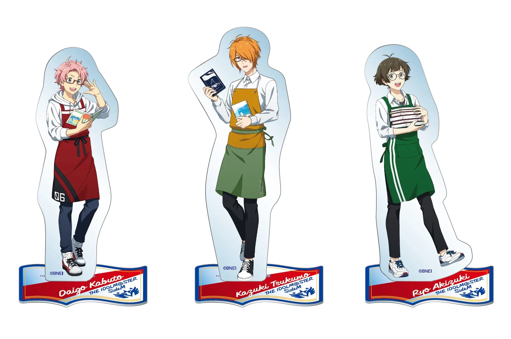 コラボキャンペーンに合わせて、開催店舗のうち一部の書店店頭にて、アイドルマスター SideMに登場する秋月 涼、九十九 一希、兜 大吾で結成されたアイドルユニット「F-LAGS」のアクリルスタンドなどオリジナルグッズの受注販売が実施されます。