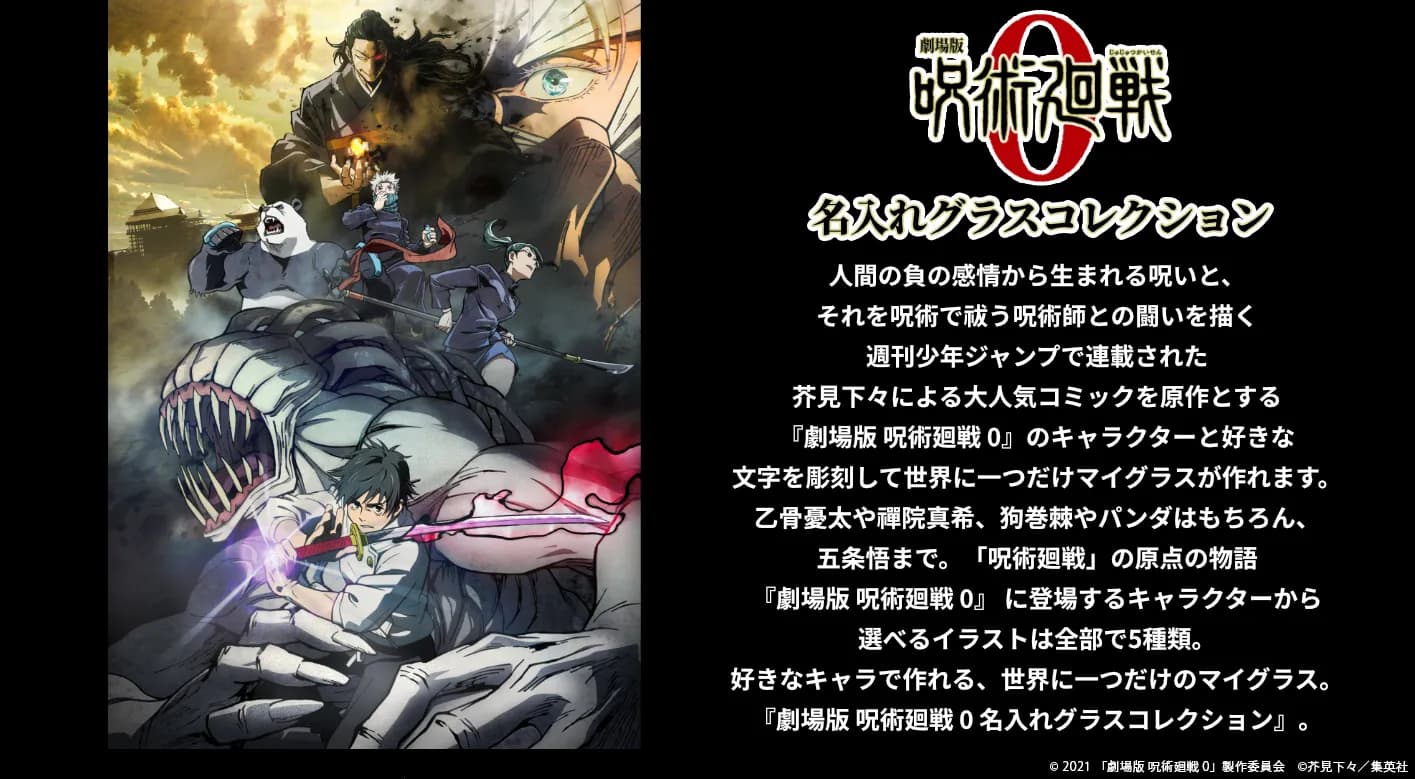 『劇場版 呪術廻戦 0』は、「呪術廻戦」の前日譚、「呪術廻戦0 東京都立呪術高等専門学校」(通称“0巻”)を描いた劇場版アニメです。今回販売開始された「『劇場版 呪術廻戦 0』 名入れグラスコレクション」では、作品に登場するキャラクターと好きな文字を彫刻して、世界に一つだけのマイグラスを作ることができます。