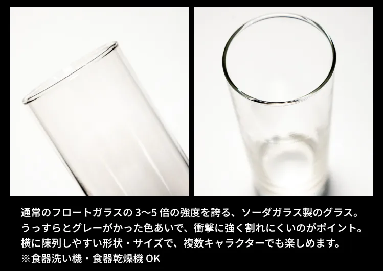 ①フロートガラスの3~5倍の強度を誇る、ソーダガラス製のグラス