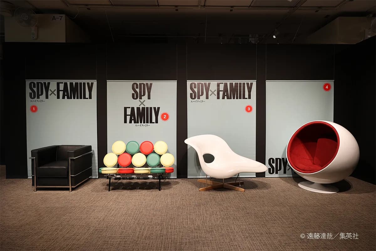 第1話のネームやアナログ原稿が丸ごと展示され、本邦初公開となる設定資料集も充実しています。展示の最後には、コミックス表紙でフォージャー家が座っているデザイナーズチェアで写真を撮ることも可能です。