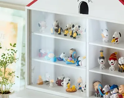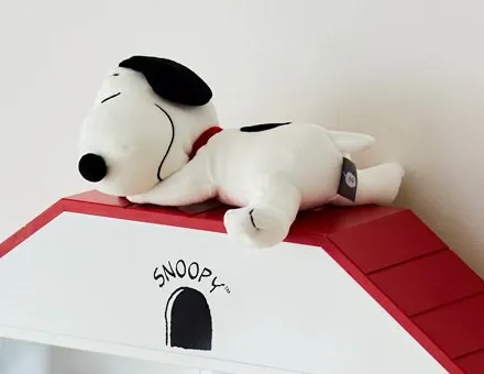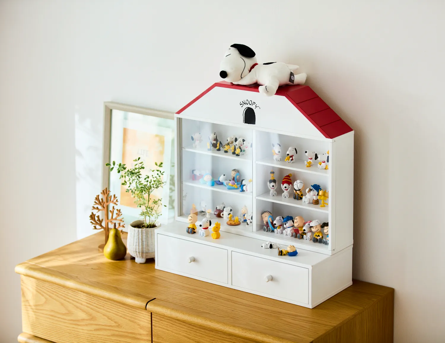 「フィギュアなど、小さなコレクションアイテムを飾りながら収納できるものが欲しい」というファンの声から生まれたのが、スヌーピーのフィギュアなどを並べて飾ることができる大容量の収納ラックです。スヌーピーの犬小屋をモチーフにしたデザインと、「見せる収納」としてディスプレイすることを想定したほこり予防のためのアクリル扉が魅力的。さらに、ヌーピーが屋根の上で寝そべる姿を再現できるように、平らな形状を採用した屋根もイチオシポイントです。