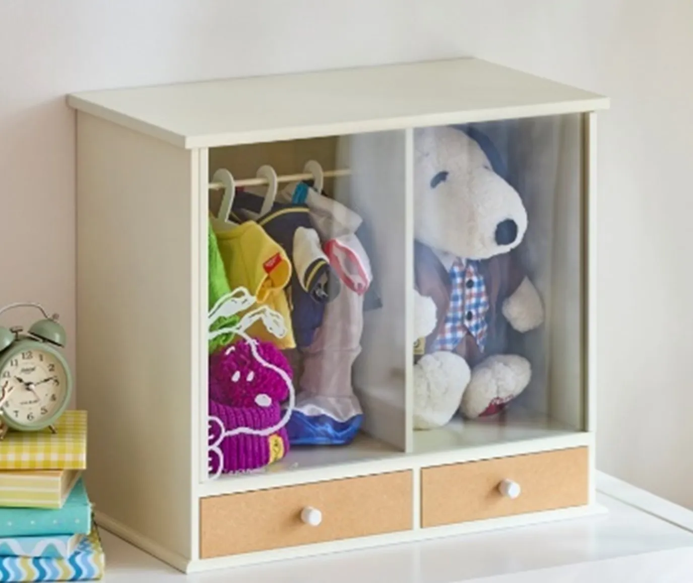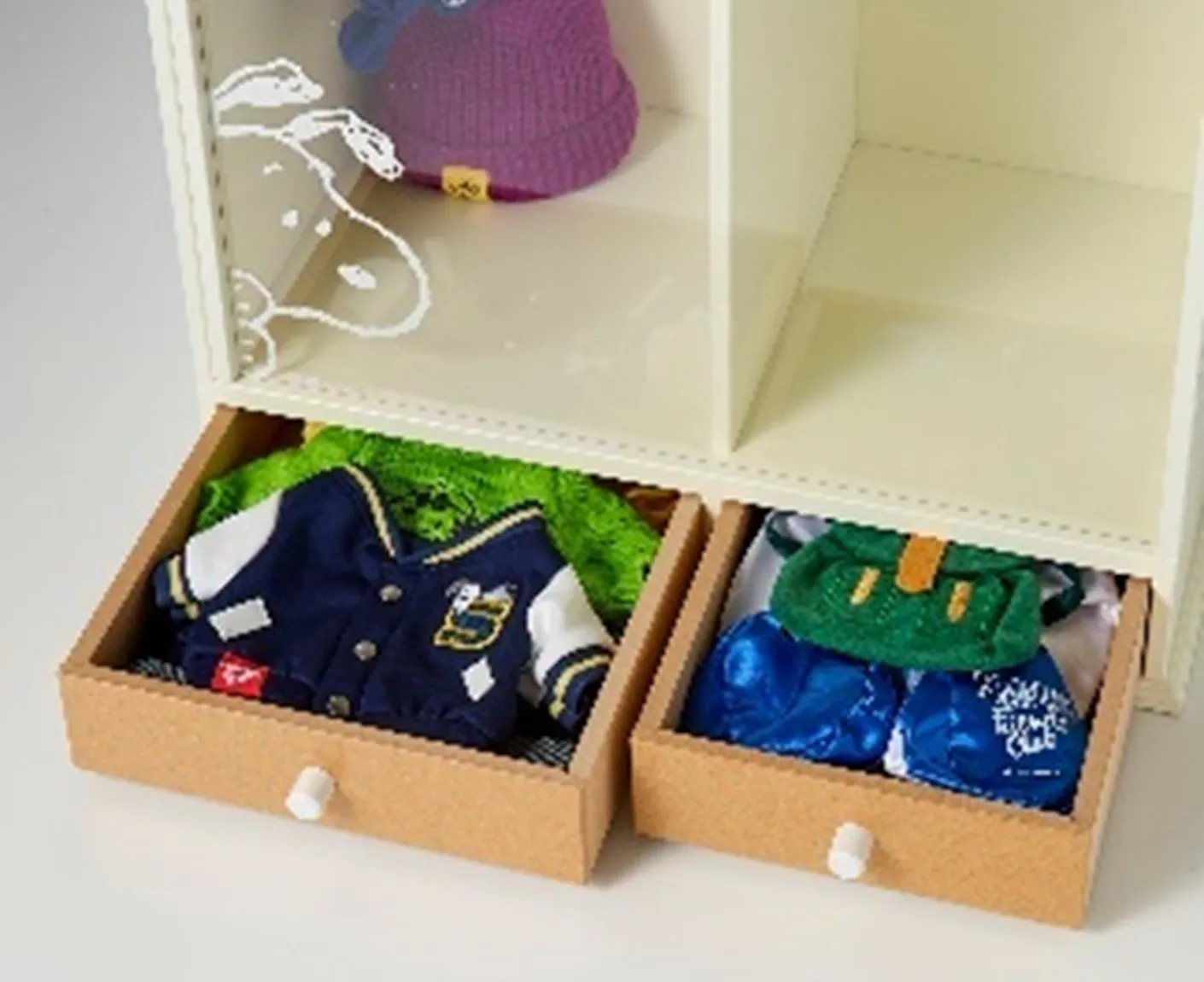 スヌーピーのぬいぐるみと、ぬいぐるみの衣装を一緒に飾って収納できる専用ケースです。アンケートで寄せられた「部屋になじむカラーリングにしてほしい」という意見を反映させたシンプルなデザインと、白がベースとなっているスヌーピーをほこりから守るためのアクリル扉がポイントです。
