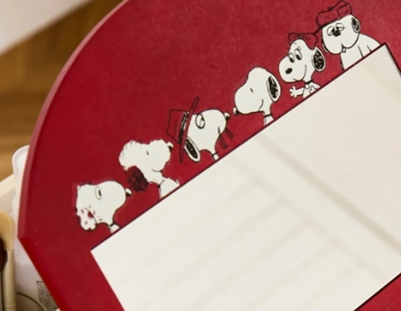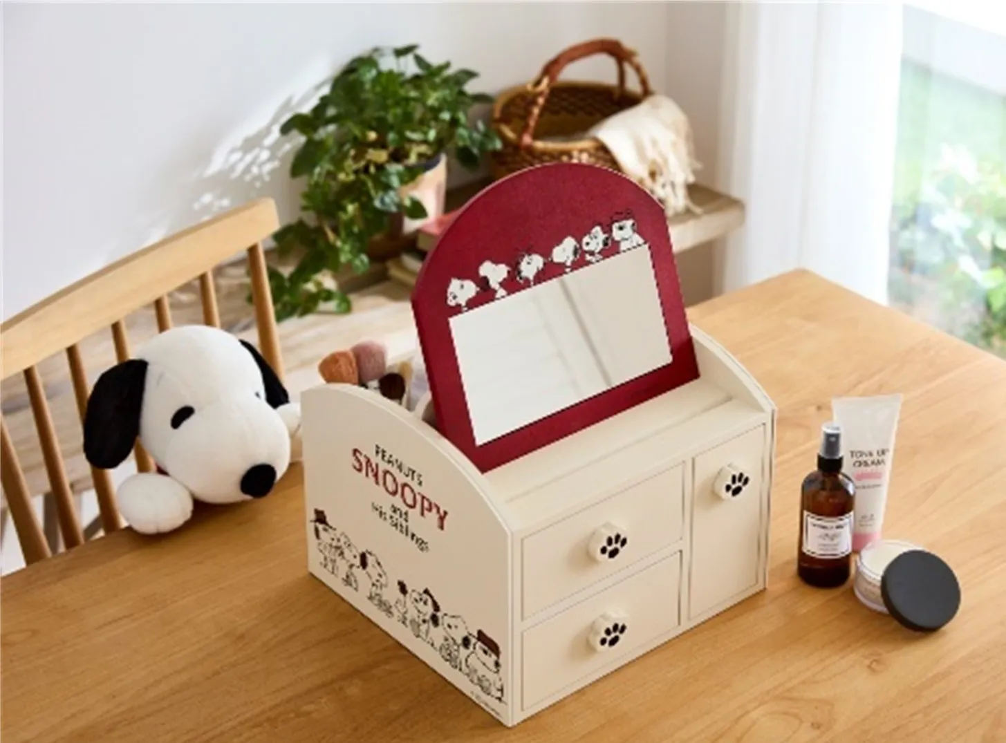 化粧品を収納できる商品を要望する声が多く寄せられたことから開発に至った、収納できるミラーがついた卓上メイクボックス。ポイントは、可愛らしいスヌーピーの足跡のデザインがあしらわれた引き出しの取っ手と、スヌーピーのきょうだいたち6人が勢揃いしたイラストが用いられているところです。スヌーピーのきょうだい6人が揃っているデザインのニーズの高さに合わせて開発されました。