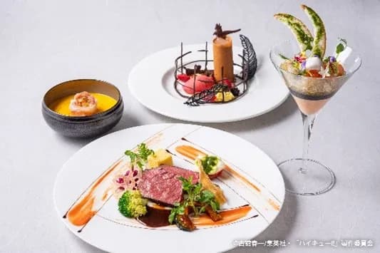 ラウンジ「エスタシオン カフェ」、レストラン「ア ビエント」、日本料理「旬彩」で展開される、「ハイキュー!!」の各校・キャラクターをイメージしたコラボメニューには、特典も用意されます。