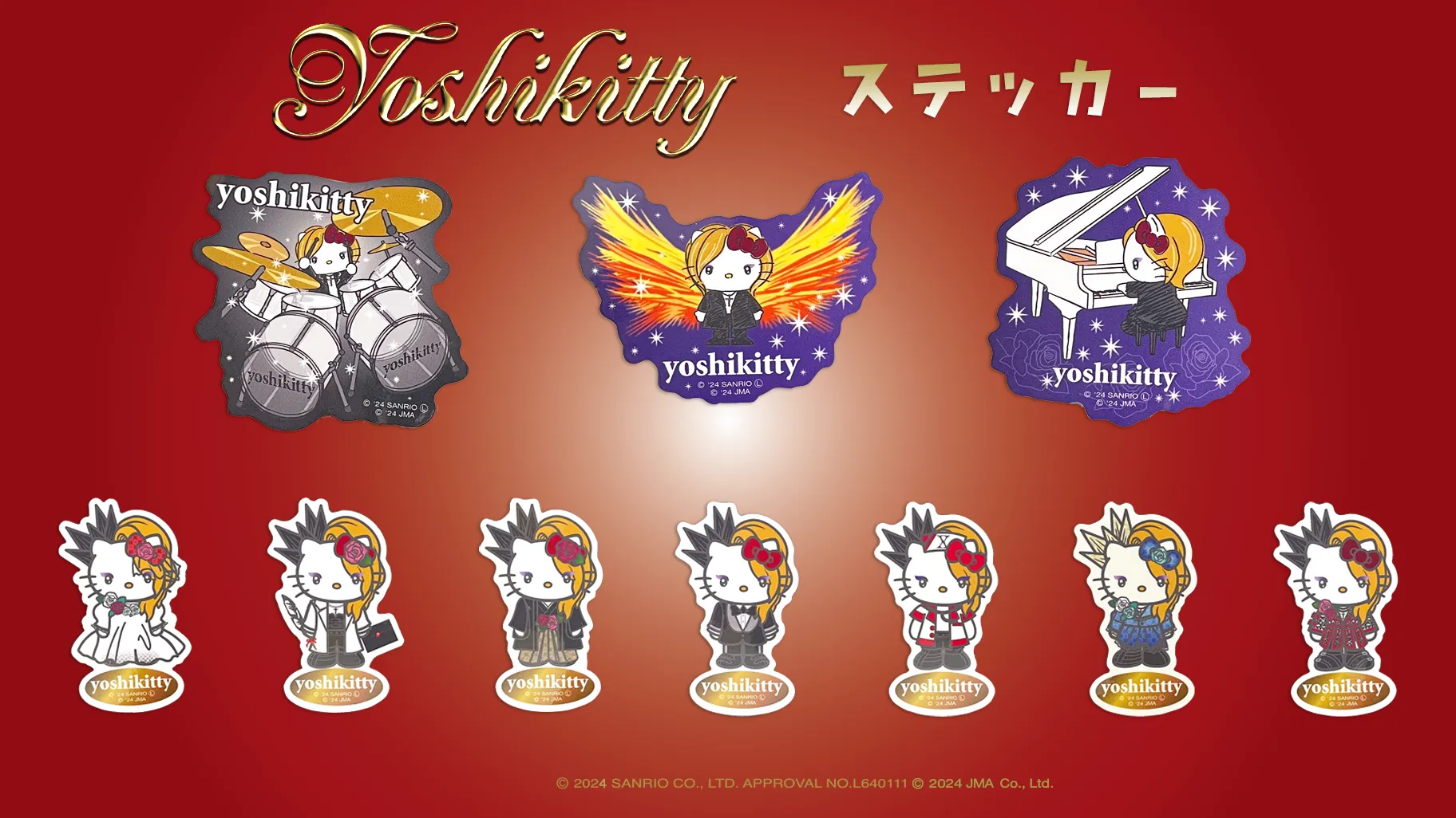 画像上の、ドラム(yoshikittyがドラムを演奏)、炎翼(炎の翼を広げている)、ピアノ(ピアノを演奏)の3種は新しい髪型に変えたyoshikitty新デザイン。そしてyoshikittyが多彩な衣装を着用した7種類と思わずそろえたくなる合計10種類のステッカーです。